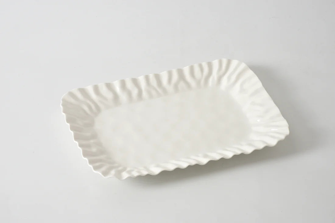 Rectangular Tray in Mascali Bianca. This rectangular beautiful tray makes an easy transition from oven to table. Perfect for serving main courses and large sides! Versatile high-fired porcelain pieces that are microwave safe! Food safe, dishwasher safe, oven safe to 500°F. Tarnish and stain-free. Easy Care.